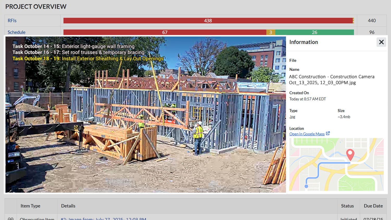 EarthCam’s ninth-generation integration with Procore now includes automated schedule visualization, providing a seamless link between project schedules and high-resolution visual data. By connecting EarthCam’s Control Center software with Procore Schedule, tasks, such as excavation, concrete pouring, or equipment installation, are overlaid directly onto live or archived images. This results in a one-stop visual timeline, allowing teams to automatically match key construction milestones with jobsite imagery, reducing the need for manual uploads or tagging.